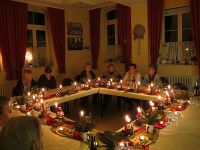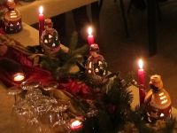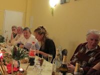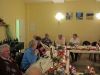 Die Weihnachtsfeier vom Heimatverein fand am 14. Dezember 2012 im Hochstedter Bürgerhaus statt. Wie immer hatten wir vorher für gemütliche Stimmung mit weihnachtlicher Dekoration gesorgt. Dazu gehörten Samttücher in rot und gold auf den Tischen, wie auch kleine Keramikfiguren, die jeweils mit einer Kerze und einem Teelicht für die richtige Beleuchtung sorgten. Auch Tannenzweige und Nüsse gab es auf den Tischen zu finden. Wir hatten uns einen wahren Festschmaus bestellt, der aus Entenbrust, Rinderbraten und Schweinegeschnetzeltem bestand. Überpünktlich wurde das Essen gebracht, so dass kurz nach dem Beginn der Weihnachtsfeier zum Sturm auf das Buffet geblasen werden konnte.