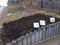 Wegen der anhaltend kalten Witterung konnte der Waid in diesem Jahr erst am 8. April in den Boden gebracht werden. Das Beet hatten wir im letzten Herbst tief umgegraben und diesmal sämtliche Waidpflanzen heraus genommen. Das Beet brauchte eine intensive "Kur", da der Boden nun doch ziemlich ausgelaugt zu sein schien. Dafür sprachen auch die letzten eher mäßigen Ernteergebnisse. Es wurde Rinderdung in Form von Pellets und Taubenmist eingearbeitet. Jetzt, nach dem Winter wurde der Boden nochmals durchgearbeitet und die Reihen für die Saat gezogen. Wie immer sollten es auch in diesem Jahr fünf Reihen werden, zu denen sich die Pflanzen aus dem Topf am Lindenborn gesellen sollten. Zunächst wurde aber gesät und die Schötchen leicht mit Erde abgedeckt. Im Anschluss kamen die Erklär-Tafeln wieder an den Rand des Beetes.