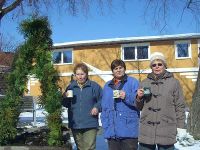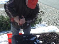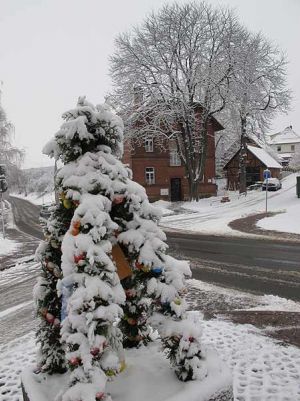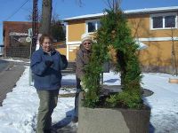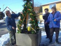 Am 15. März 2013, einem weniger kalten Tag, hatten sich die Frauen des Frauentreffs am Lindenborn zum Bau der Hochstedter Osterkrone verabredet. Die Tage davor waren von starkem Frost gekennzeichnet, so dass die Erde im steinernen Gefäß, in welches der Osterschmuck gestellt werden sollte, genauso hart gefroren war wie die Wand des Kübels. Entsprechend schlecht ließen sich die Zweige hineinstecken, die das Grundgerüst für die Krone bilden sollten. Kurzerhand wurde deshalb mit schwerem Gerät gearbeitet und Löcher in die Erde gebohrt. Anschließend wurde Grünzeug angebunden und die Ostereier angebracht. Einige Schleifen zierten die Kronenspitze und der anschließende prüfende Blick brachte die Gewissheit, das auch die diesjährige Osterkrone gelungen war.