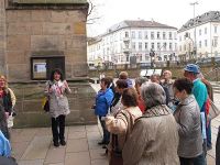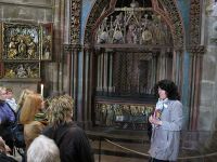 Am Portal wurden wir bereits von der Stadtführerin erwartet, die uns zunächst das Kircheninnere zeigen wollte, bevor wir uns auf den Weg in die Altstadt machen würden. Nachdem wir Eintritt bezahlt hatten begannen wir mit dem Rundgang in der Kirche. Die Stadtführerin wies darauf hin, dass die Kirche einst prächtig bemalt war, was man heute jedoch nur noch an wenigen Stellen sehen kann. Der Lettner aus dem Jahr 1343, der das Hauptschiff von der Vierung trennt ragte hoch und überaus gotisch vor uns auf. Auf der linken Seite konnten wir am Lettner vorbei in den hinteren Bereich der Kirche gehen und wir kamen zum 1250 entstandenen Mausoleum Elisabeths und deren Sarkophag mit Reliefverzierungen, die die Aufbahrung Elisabeths im Beisein zahlreicher Würdenträger und Jesus darstellten.