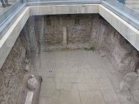Eine Treppe führte noch weiter nach oben. Diese war von ihrer Steilheit her auch nicht zu verachten. An ihrem Ende gelangten wir zu einem gläsernen Überbau. Durch die Scheiben konnte man die Reste einer mittelalterlichen Synagoge sehen, die bei Ausgrabungen freigelegt worden waren.Die Stadtführerin freute sich, dass wir etwa 10 Minuten später dran waren und wir erst jetzt zum Marktplatz mit dem Rathaus kamen. Es war kurz vor 12.00 Uhr Mittag und gleich sollte die Marburger Rathausuhr mit ihrem Programm beginnen. Unterhalb des Ziffernblatts steht die Göttin der Gerechtigkeit, Justitia, mit der Waage. Der Wächter mit der Trompete steht links und der Tod mit dem Stundenglas rechts davon. Oberhalb der Uhr ist die Kugel, die Tag und Nacht anzeigt. Wenn der Rathausgockel zu jeder vollen Stunde mit den Flügeln schlägt, dann ist es nicht dieses Federvieh, das kräht, sondern der Wächter, der trompetet, so klärte uns die Stadtführerin auf.