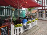 Von dort ging es geradewegs zur Oberstadt. Wie der Name schon sagt, liegt diese oben. Während über uns die Sonne lachte hatten wir unter unseren Füßen mit dem stetig ansteigenden Kopfsteinpflaster zu kämpfen. Wir hielten hier und da an, um uns ausgewählte Fachwerkhäuser anzusehen. Auf unserem Weg begegneten wir zwei weiteren zumindest zeitweise in der Stadt heimisch gewesenen bekannten Persönlichkeiten, nämlich den Gebrüdern Grimm, die hier studiert hatten. Diesmal war es jedoch kein Denkmal sondern die Köpfe der sieben Geißlein, die von einer Wand zu uns herüber sahen.
