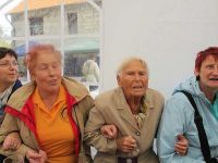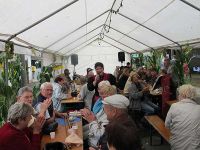 Wir trafen gegen 15.30 Uhr ein und kamen gleich mal mit einem Schauer am Platz des Geschehens an. Wir wurden von unseren Rohrborner Freunden begrüßt und suchten uns dann zuerst einen trockenen Platz unter einem Zeltdach in der Nähe des Waidglücksrades. Nach dem Aufwärmen mit Kaffee und der Stärkung mit Kuchen fanden wir im Hauptzelt einen Tisch, an dem wir uns niederließen. Regina Ross sorgte hier für die musikalische Unterhaltung und wir für Stimmung im Zelt. Wir schunkelten was das Zeug hielt und stärkten uns mit Bratwürsten und Bräteln.