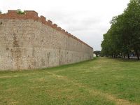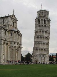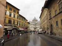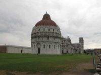 Das Tor erreichten wir nach wenigen Metern und schon als wir es durchschritten, hatten wir einen guten Blick auf das Baptisterium - eine der größten Taufkirchen der christlichen Welt- , den Dom und den Schiefen Turm dahinter. Unzählige Touristen drängten sich vor den Rasenflächen und hatten, als Hintergrund zum Fotografieren, den Schiefen Turm gewählt. Sie machten eigentümliche Verrenkungen und ließen sich so ablichten, als würden sie den Turm umschieben oder stützen – je nachdem welche Seite gewählt wurde. Wir gingen an den drei Gebäuden, dem Hauptweg folgend, vorüber und fotografierten was das Zeug hielt. Sie waren komplett mit Carrara-Marmor verblendet, wobei der Turm wegen seiner 4,1 Meter Schieflage besonders ins Auge sprang. Dann, am Schiefen Turm angelangt, schlugen wir den Weg in die Straße St. Maria ein und folgten ihr in Richtung auf den Arno zu.