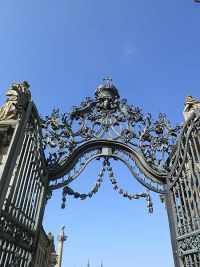 Wir verließen die Residenz und setzten die Führung im Hofgarten fort, wohin wir durch ein Barockportal gelangten. Über uns wölbte sich noch immer der ungetrübte, eigentlich sommerlich blaue Himmel, der den Garten ins rechte Licht setzte. Neben Skulpturen und Brunnen mit Wasserspielen waren die alten zu Kegeln geschnittenen Koniferen ein echter Blickmagnet. Rings um den zentralen Brunnen wechselten sie sich mit Bänken, Rasenflächen und Blumenrabatten ab.