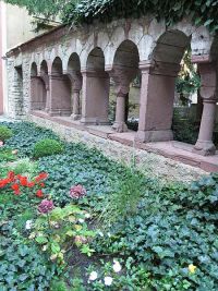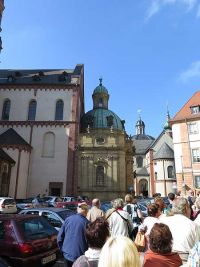 Von hier setzten wir unseren Weg in Richtung Mainufer fort. Frau Volmer wies noch einmal darauf hin, dass die Stadt zu 90 % in einem Bombardement zerstört worden und der größte Teil der Bevölkerung obdachlos geworden war. Der Aufbau war damit besonders eilig und man konnte sich daher nicht so sehr an alte Bebauungspläne halten und auch nicht an die Rekonstruktion der Häuser, so wie sie einmal ausgesehen hatten. Dadurch wirkt die Innenstadt Würzburgs durch die wiederaufgebauten Kirchenbauten einerseits alt, auf der anderen Seite aber durch dazwischen gepresste, neuere Bauten mit ihren nüchternen Fassaden wie ein zusammengewürfeltes Mosaik aller Stilepochen.