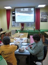 Dazu wurden die Tische, Stühle und Bänke so aufgestellt,  das jeder einigermaßen gut die Leinwand sehen konnte. Dann galt die weitere Aufmerksamkeit dem Aufbau der Technik, wobei es zur Probe ein Problem mit dem Ton gab. Bei der Wiedergabe eines Filmchens stellte sich die Klangqualität des Bildwerfers als Katastrophe heraus. Sie war zu blechern und viel zu leise. Die Idee, an der Klinkenbuchse für die Kopfhörer einen Kleinlautsprecher für mobile Endgeräte zu installieren scheiterte nach zwei Fehlversuchen ebenfalls kläglich, wegen zu geringer Lautstärke. Dafür hatten sie aber einen besseren Klang. Am Ende kam ein anderer Rechner zum Einsatz, an welchen Lautsprecherboxen mittels USB-Anschluss gekoppelt wurden.