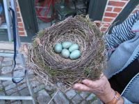 Betrübt sah sie dabei zu, wie ihr mühsam auf dem Maibaum errichtetes Nest von diesem getrennt wurde. Es wurde von der Leiter herunter gereicht und jetzt konnte sie jeder sehen: fünf grünliche Eier, die Eier, die sie gelegt hatte und ab dem dritten Ei in den letzten Tagen schön warm hielt und bebrütete. Ängstlich verfolgte die Amselfrau, wie die Menschen den Maibaum von der Halterung herunter hoben um ihn im Museum zu deponieren. Dann standen die Menschen in einer Gruppe herum und betrachteten mit grinsenden Minen die Eier der Amselfrau, die langsam auszukühlen drohten. Misstrauisch beobachtete sie, wie einer der Pflanzkörbe, die im letzten Jahr noch vor dem Museum Margeriten beherbergten und sich nun teilweise in seine Einzelteile auflöste, da der Boden herausgefallen war, auf eine der Halterungen des Maibaums gesteckt wurde. Dort hinein stellten die Menschen das Nest und entfernten anschließend die Leiter. Nach einiger Zeit traute sich der Amselmann bis zur Dachrinne des Museums heran und die Amselfrau flog vor dem Korb auf der Stelle und begutachtete das, was die Menschen angestellt hatten. Nach einer Festigkeitsprobe entschied sie sich dafür, das Gelege weiter zu bebrüten.