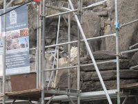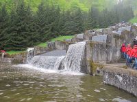 Bis zur Herkules-Statue auf dem achteckigen Gebäude, dem Oktogon, waren es noch ein paar Schritte zu gehen und wir erfuhren währenddessen etwas über die Geschichte des Bergparks, der erst vor wenigen Jahren auf die UNESCO-Welterbeliste gekommen war. Ab 1692 entstand er in barocker Form unter Landgraf Karl. Bis weit ins 19. Jahrhundert hinein wurde jedoch an den Wasserspielen gebaut, wobei jede Stilepoche dem Park seinen Stempel aufdrückte. Ab 1701 wurde mit dem Bau des Oktogons und den davor befindlichen Wasserkaskaden, die eine gerade Wasserachse den Berg hinunter bilden. Bei unserem Besuch war das Oktogon leider eingerüstet und unsere Führerin meinte, dass der Zahn der Zeit schon mächtig an den Steinen genagt hat, so dass man das Bauwerk restaurieren muss damit es nicht verfällt. Wir gingen um das Oktogon herum und erreichten die oberen Kaskaden, die ebenfalls mit Gerüsten versehen waren. Wie gingen die ersten Stufen, von über 300, die noch folgen sollten, hinunter und befanden uns dann an einem großen Wasserbecken. Wir hatten Glück, dass die Sonne sich heute hinter dichten Wolken versteckte, weil der Besucherandrang sonst noch viel größer gewesen wäre.