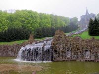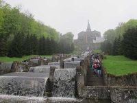Wir folgten den Kaskaden über zahlreiche Stufen. Neben uns plätscherte das Wasser und zwang uns am äußersten Rand der Stufen zu gehen, um nicht nassgespritzt zu werden. Nässe kam allerdings in feiner Tröpfchenform auch vom Himmel - ein Sprühregen hatte eingesetzt. Am Ende der Wassertreppen standen wir wieder an einem Becken und beobachteten, wie das Nass einen Vorhang vor einer kleinen Grotte bildete, in der sich Neptun persönlich versteckte. Damit hatten wir den barocken Teil der Wasserspiele passiert.