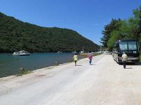 Für unsere Selbsterkundung in Rovinj hatten wir zwei Stunden Zeit, der Bus sollte uns also um 16.35 Uhr zurück zum Hotel bringen. Auf der Rückfahrt wollten wir noch bei Straßenhändlern anhalten, die Olivenöl, Grappa und verschiedene Sorten Honig anboten. Gegen 17.10 Uhr kamen wir dort an und stürmten auf die vier bis fünf Buden am Straßenrand, hoch über dem Limski Fjord, los, die durchweg meistens hochprozentige Sachen anboten. Da gab es Grappa mit Feige, mit Birne, mir Zitrone, mit Kirsche, sowie Honig aller Art, und auch einige Sorten Öle. Von verschiedenen Aussichtsplattformen konnten wir den Fjord überblicken. Vom vielen Probieren der unterschiedlichsten Schnäpse hatte so mancher einen „Kleinen in der Birne“. Auf die Frage eines Reisegastes wozu er denn Honig kaufen sollte, meinte die Händlerin, die auch im Marco Polo Reiseführer abgelichtet ist: "Nun, du musst untenrum einschmieren und dann ablecken". Wir lachten über die Schlagfertigkeit der Händlerin. Als der Kaufrausch vorüber war fuhren wir zurück in Richtung Hotel.