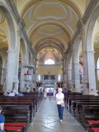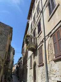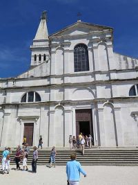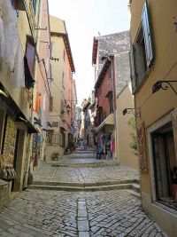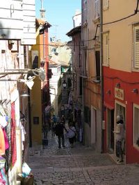 Das zentrale Bauwerk der Stadt und gleichzeitig der Landzunge war die Basilika der heiligen Euphemia, die auch an der höchsten Stelle erbaut worden war. Durch enge, mittelalterlich anmutende Gässchen stiegen wir den Hügel hinauf zur Basilika. Über ähnliche Gässchen ging es auf der anderen Seite wieder nach unten. Blank und glatt gelaufenes Pflaster machten den Abstieg schwierig. Der Weg war abschüssig und führte über einige Stufen hinunter auf die andere Seite der Stadt und zum dortigen Hafen.