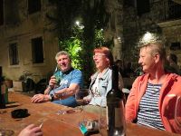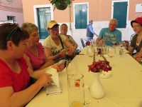 Nach dem Abendessen hatten wir uns vorgenommen noch nach Poreč hinüber zu laufen. Dort angekommen hatten wir eine gemütliche Gaststätte gefunden, die uns mit vorzüglichem Wein bewirtete. Wir lachten darüber, dass wir andere Gäste – Radfahrende Bayern - herein lockten und über Sachen wie den „Damfschnuller“ - gemeint war die Bockwurst, die bei uns Dampfriemen genannt wird. Es gab aber noch andere Lachbarkeiten, wie eine Tafel mit der Aufschrift „ Sieste 15 – 18 Uhr“. Wir lachten, weil es von einem unserer Gruppe wie "siehste" vorgelesen wurde, gemeint war aber Siesta und wir krümmten uns vor Lachen. Gegen 23.00 Uhr waren wir zurück im Hotel und gingen auf unsere Zimmer, denn schon am nächsten Morgen sollte es um 8.00 Uhr in Richtung Süden weiter gehen.