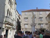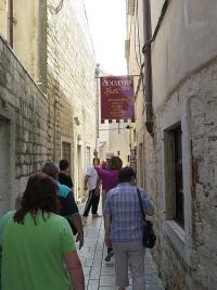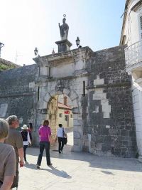 Um 9.35 Uhr hatten wir den Treffpunkt mit der Stadtführerin in Trogir erreicht. Nur wenig später begann die Stadtführung auf der städtisch bebauten Insel. Vor einem alten Stadttor erklärte die Gästeführerin wo die nächsten Toiletten zu finden wären, bevor wir durch das Tor die Stadt betraten.