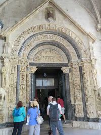 Wir schlängelten uns durch enge Gassen, über glattgelaufene Pflastersteine bis hin zum zentralen Platz vor der Kathedrale. Diese bestach durch ihre vielen Stilrichtungen, von der Romanik über die Gotik (auch Venezianischer Gotik) bis hin zur Renaissance. Sie zählt ebenfalls zum UNESCO-Weltkulturerbe (wie die gesamte Altstadt) und ist einzigartig auch durch das Relief-Eingangsportal mit der bildlichen Darstellung der Geburt Jesu, direkt über der Tür und seitlicher Darstellung von verschiedenen Monaten, wie dem Dezember mit dem Schlachten von Schweinen, dem Januar mit fertiggestellten Würsten, dem März mit dem heidnischen Mars, dem Juni mit dem Scheren der Schafe usw.