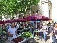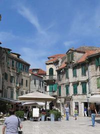 Wir gelangten auf einem weiteren Platz der Altstadt, die sich im Westen an den ehemaligen Kaiserpalast anlehnt, den Trg Braće Radica oder von den Einheimischen Obst-Platz genannt, weil hier früher mit Obst gehandelt wurde. Dort steht das Denkmal für den kroatischen Dichter Marko Marulić (1450-1524), welcher in Split geboren wurde. Eine Ecke des Platzes wird von einem achteckigen venezianischen Turm eingenommen, das Überbleibsel einer Festung aus dem 15. Jh.