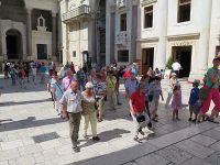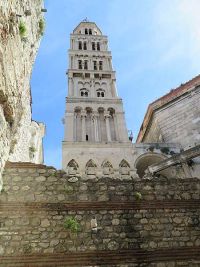 Nachdem wir enge Gässchen und Treppen hinter uns gelassen hatten befanden wir uns im Bereich der ehemaligen kaiserlichen Privatgemächer. Hier konnte noch antike Fußbodenmosaike bewundert werden, aber auch die rekonstruierte Innenfassade der Palastmauern. Gegenüber gab es jedoch auch halb zerfallene Häuser in denen augenscheinlich noch gewohnt wurde. Gleich neben der Kathedrale des Heiligen Dominus mit ihrem Kranz aus insgesamt vierundzwanzig Säulen, erfuhren wir von Beti, dass die Kirche eine der ältesten der katholischen Glaubensgemeinschaft sei. Ursprünglich war sie das Mausoleum Kaiser Diokletians und das seiner Gattin. Nachdem jedoch die Salonitaner die Stadt bewohnten, wurden die Gebeine der einstigen Herrscher daraus entfernt. Diokletian war einer der letzten großen Christenverfolger und hatte viele Christen hinrichten lassen. Die Gebeine einiger Märtyrer, die unter ihm ums Leben gekommen waren, wurden von nun an in der Kirche verehrt.