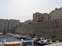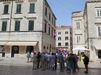 Gegenüber steht der beim Erdbeben nicht zerstörte Sponza-Palast. Hier war einst das Zoll- und Schatzamt der Stadt untergebracht. Rechts daneben gibt es einen Durchgang zum Hafen und daneben steht der Uhrturm. Daniela meinte, dass sich die Einwohner der Stadt an den Glockenschlägern der Uhr im Turm orientierten und nicht unbedingt eine bei sich haben müssen. Wir gingen weiter, am Rathausbau, dem Rektorenpalast, mit seinem herrlichen Innenhof vorbei. Wir machten kurz Halt an der im römischen Barock sehr schlicht gehaltenen Kathedrale Sv. Gospa. Gegenüber betraten wir durch ein Tor den alten Hafen. Hier legen die Ausflugsboote zur gegenüber liegenden Insel Lokrum ab. Da der Wind ziemlich heftig an diesem Tag wehte, beneideten wir die Ausflugsgäste nicht.