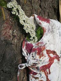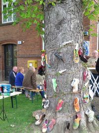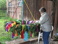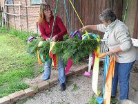 Auch die Dekoration war schon verarbeitet und verteilt, die bis in den letzten Schuh durchgezogen wurde. Der Renner waren allerdings aus alten Pullis hergestellte Sitzauflagen für die Biertischgarnituren, die unsere Monika in wahrer Fleißarbeit hergestellt hatte. Allerdings konnten wir wieder feststellen, dass wieder ein Vogel auf dem Maibaum sein Domizil errichtet hatte. Das Nest war jedoch leer. Wir pflanzten es wieder auf den Flechtkorb um, wie schon im vergangenen Jahr.