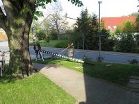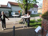 Wieder einen Tag darauf war es dann soweit, dass der Maibaum aufgestellt werden konnte. Wie immer hatten wir die Werbetrommel gerührt und die Hochstedter noch einmal darauf hingewiesen. Das Wetter machte aber kaum Anstalten sich wesentlich bessern zu wollen. Trotz Sonnenschein blieb es eben kühl und frisch. Mutig wie wir waren, hatten wir trotz eingerichtetem Bürgerhaus zwei unserer Falt-Pavillons vor dem Museum aufgestellt. Das ging schnell und wenn es doch regnen sollte, war wenigstens ein bisschen Schutz von oben vorhanden.