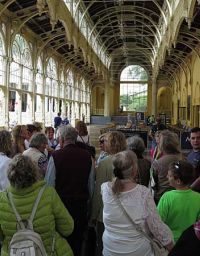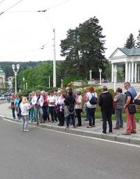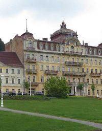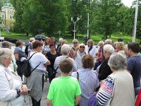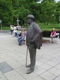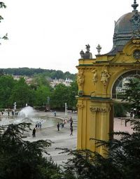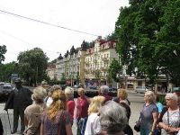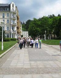 Kurz darauf hatte sich die Sonne durch die Wolken gekämpft und die Temperatur auf 18°C hinauf. Bei herrl6chstem Sonnenschein und 20°C erreichten wir Marienbad - wir waren zu spät. Damit hatten wie ein Platzkonzert im Kurpark verpasst, wie uns die Stadtführerin mitteilte. Die Führung begann am Kurpark an einem Denkmal mit zwei Skulpturen, die einen Zaren und einen Kaiser darstellen. Es war nämlich 1897, als der spätere britische König Edward VII. zum ersten Mal zur Kur nach Marienbad kam, was den Ruf des Bades ungemein förderte. Im Jahr 1904 besuchte ihn dort der österreichische Kaiser Franz Joseph I. Aus diesem Grund stehen diese beiden Bronzefiguren im Park.