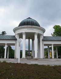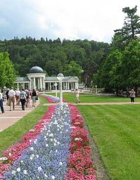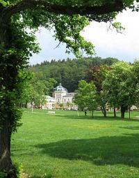 Hier sprudelten mehrere Heilquellen, die die verschiedensten Leiden lindern oder gar heilen sollten. Wir hatten schon im Bus vor dem Trinken des Wassers der Kreuzquelle gewarnt, da sie stark abführend wirkte. Darum würde hier auch darauf geachtet werden, dass keiner der Mitreisenden von dem Wasser trank. Nach einem Schluck aus der Rudolfsquelle oder von einem der anderen Wasser gingen wir weiter, den Kurpark Richtung Ausgangspunkt hinunter.