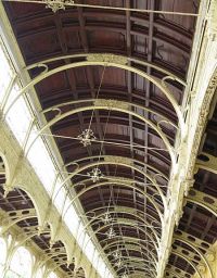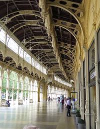 Es ging weiter zu den Kolonnaden, die etwas unterhalb lagen. Hier war auch das runde Becken des singenden Brunnens zu sehen, welcher unterschiedlichste Wasserfontänen in die Luft schleuderte. Gleich daneben ist der Zugang zur Wandelhalle mit ihrer gusseisernen Gewölbten Konstruktion. Über uns, zwischen den einzelnen Segmenten der Decke, hatte man Fresken an das Gewölbe gemalt. Wir schlenderten durch die Kolonnade und gelangten zum Quellhaus.