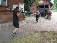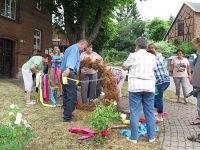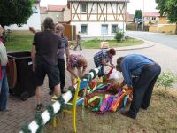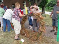 Zuvor war jedoch der Abbau des Maibaumes geplant, der seit Ende April vor dem Bürgerhaus stand und nun schon recht vertrocknet und braun aussah. Schnell war er aus der Hülse gehoben und der Kranz abgenommen. Der Stamm wurde wieder unter das Dach des Museums gebracht und der Kranz abgeschmückt.