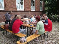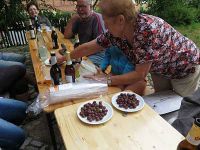 Die 147. Vereinssitzung am 12. Juli 2016 war eigentlich eine ganz gewöhnliche Sitzung, die jedoch wegen des schönen Wetters im Hof des Bürgerhauses stattfinden konnte. Kurzerhand waren Tische und Bänke aufgestellt worden, wie auch Getränke und sogar Obst. Bei diesem handelte es sich um Stachelbeeren aus eigener Ernte, denn die waren zwischen den Weinreben am Schauweinberg gegenüber des Museums gereift. Wie sonst im Oktober zur Weinlese, gab es diesmal also die süßen Stachelbeeren zum Probieren.