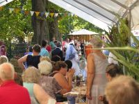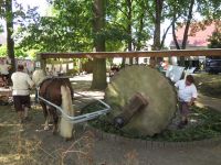 Wie in jedem Jahr besuchten wir auch wieder eine Woche vor unserem Waidfest das Waidmühlenfest in Rohrborn. Bei den Rohrbornern war es diesmal das 11. Fest dieser Art, sie "hinken" ein Jahr hinter uns her. Diesmal hatten sie hochsommerliches Wetter mit Temperaturen von jenseits der 30°C-Marke erwischt. Auch in Rohrborn war der trockene Sommer nicht spurlos vorübergegangen, so dass Waid "importiert" werden musste, damit die Mühle sich drehen konnte. Im eigenen Garten war er - genau wie bei uns auf dem Waidbeet - noch längst nicht so hoch gewachsen. Trotz der Temperaturen waren viele Gäste nach Rohrborn gekommen, wenige jedoch mit dem Fahrrad wie sonst.