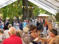 In diesem Jahr hatten sie sich für den Nachmittag etwas anderes einfallen lassen, denn es wurde eine Brautmodenschau gezeigt. Sämtliche Kleider und Anzüge stammten dabei aus Rohrborn. Mit viel Mühe und Aufwand zogen die Models über den Platz, nur um sich gleich wieder umzukleiden. Bei reichlich Trinkbarem und begleitet von Blasmusikanten ging es so durch den heißen Nachmittag. Wir verabschiedeten uns von den Rohrbornern, hatten wir doch in genau einer Woche selbst unser Fest - und es stand dafür noch kein Zelt!