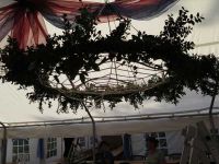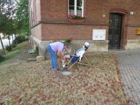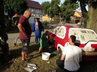 Auch das Färben selbst klappte wunderbar - damit konnte, was dies betraf, am nächsten Tag nichts schief gehen. Unmittelbar neben des Färbetopfes wurde mit anderen Farben gearbeitet. Das Kinderprojekt sollte wieder mit malen zu tun haben. Dabei durften die Knirpse sich diesmal mächtig beim Bemalen eines PKW ins Zeug legen. Dieser wurde zunächst präpariert, wobei die Teile, die nicht mit Farbe in Berührung kommen sollten abgeklebt werden mussten. Im Bürgerhaus war man unterdessen beim Kuchenschneiden, denn zahlreiche Kuchenbleche waren inzwischen dort abgegeben worden. Auch galt es weiter an der Dekoration zu feilen. Neben Getreidegarben mussten die Kronleuchter nun mit frischem Grün behangen werden.