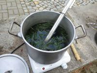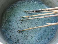 Um zu sehen, ob unsere Färbechemikalien überhaupt noch zum Färben taugten, wurde am Nachmittag eine Probefärbung durchgeführt. Schon beim Einrühren des Waschsoda zeigte sich blauer Schaum - im Waid war also Farbe!