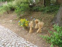 Am Vortag zum Waidfest galt es wichtige Dinge zu erledigen. Ein Präsent war vorbereitet worden für Herrn Friebel, dem Geschäftsfüher der Landgut Kornhochheim GmbH. Das Präsent in Form von unserem Waidschnaps war als Dankeschön gedacht für die Belieferung mit frischen Waidblättern. Die Landgut Kornhochheim GmbH bestellt Ackerflächen mit Waid für die Industrie und war bereit, uns mit Waidblättern auszuhelfen, da unser Beet allzu dürftig aussah. Es war in der Vergangenheit einfach zu trocken gewesen. Da wir das Beet nicht gänzlich abernten wollten, mussten wir also Waid zum Färben "importieren".