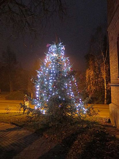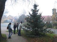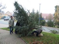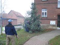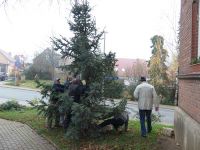 Der 26. November war im Jahr 2016 der Tag vor dem 1. Adventssonntag. Daher war dies wieder der Tag, an dem der Hochstedter Weihnachtsbaum aufgestellt und geschmückt wird. Wie schon in den vergangenen Jahren, sollte das Aufstellen des Baumes selbst um 15.00 Uhr beginnen. Die Vorbereitungen dafür fingen jedoch schon früher an. Immerhin musste die Baumhülse aufgeschraubt und erst einmal der Baum geholt werden. Diesmal kam er aus der "Alte Schmiede", von wo er mit dem Kleintraktor zum Bürgerhaus gebracht wurde.