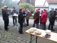 Mit der Ankunft des Baums am Bürgerhaus, war auch das Aufstellen gesichert und damit das Herzstück der Veranstaltung. Es galt aber noch zahlreiche andere Vorbereitungsarbeiten zu erledigen. Da waren Brote zu schmieren, der Glühwein aufzuheizen, der Feuerkorb zu befeuern und schon erste Gäste zu begrüßen, wie die Landtagsabgeordnete Karola Stange, die alljährlich gerne nach Hochstedt kommt - nicht nur zum Weihnachtsbaumsetzen.