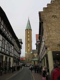 Vom Parkplatz bis ins Zentrum war es nicht weit. Nach etwa fünf bis zehn Minuten gemächlichen Ganges war die Altstadt mit dem Weihnachtsmarkt erreicht. Die Kirche Cosmas und Damian wurde ab 1170 errichtet. Mit ihren unterschiedlichen Turmspitzen beherrscht sie hier den Marktplatz. Direkt vor der Kirche war auch ein erster Glühweinstand. Daneben schloss sich das Rathaus von Goslar an, dessen Baubeginn im 15. Jahrhundert lag.