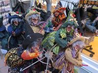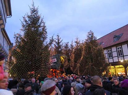 Einen weiteren Höhepunkt des Weihnachtsmarktes von Goslar bildet der Weihnachtsweld. Hier stehen Tannen an Tannen, die mit einem Lichternetz überzogen sind. Dazwischen befinden sich Glühweinbuden und Platz zum trinken. Wir gingen ein Stück in die Nebengassen und entdeckten das Puppen- und das Musikinstrumentemuseum mit zwei Skulpturen, die vor dem Haus sitzen. Harzer Hexen dürfen als Puppen und Mitbringsel natürlich nicht fehlen