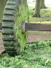 Unterdessen staunten viele Gäste - zumeist aus Sömmerda - wie sich das schwere Waidmühlenrad über die Pflanzenblätter bewegte und sie dabei zerquetschte. Gezogen wurde das Rad von einem Pferd, das brav seine Runden drehte während die Waidknechte mit Gabeln die Blattmasse neu sortierte. Wir wurden von unseren Freunden von der Rohrborner Dorfgemeinschaft herzlich begrüßt und zu Kaffee und Kuchen eingeladen. Unter den Zeltdächern ließ sich gut feiern, trotzdem drehten wir eine Runde auf dem Festplatz und bewunderten die neu aufgestellten Figuren der Rohrborner.