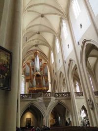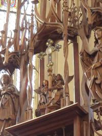 Herausragend in der zwischen 1311 und 1484 errichteten Kirche ist der herrlich gearbeitete Schnitzaltar von Tilman Riemenschneider, den alle bewunderten. In diesen von 1500 bis 1505 entstandenen Altar integriert, ist ein Kreuz mit einem Bergkristall als Reliquie, die Weintropfen des letzten Abendmahls Christi enthalten soll (durch Wandlung - zum Blut Christi). Dieses Abendmahl war auch das Thema der Altarschnitzereien. Die Stadtführerin erklärte, dass Riemenschneider für seine hervorragenden Figuren weniger Lohn erhalten hatte, als jener Schnitzer, der den Rahmen gearbeitet hatte. Der Altar stand quasi über einer Nebenstraße, die wir später noch sehen würden, und war über eine hohe Treppe zu erreichen.