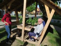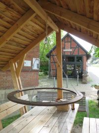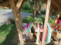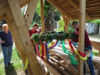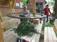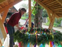 Während unseres Museumsputzens hatten wir die Idee den Hochstedter Maikranz diesmal ganz öffentlich zu binden. Am 27. April 2018 gingen wir ans Werk. Zum Kranzbinden eignete sich ausgezeichnet die überdachte Bank vor dem Bürgerhaus, weil man im Gebälk ganz wunderbar den Kranz aufhängen konnte, um ihn dann im Sitzen zu binden. Eine Flasche Bier passte auch noch auf den Tisch über dem der Kranz schwebte.