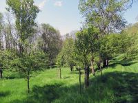 Auf der anderen Seite ging es den Taleinschnitt wieder hinauf und wir erreichten eine Wildblumenwiese. Hier stand ehemals auch lange Zeit eine Bank und wir hatten die Idee bei unseren Festen im Mai Spenden für eine neue Bank an dieser Stelle zu sammeln. Von hier war es nicht mehr weit bis zum Steinbruch. Zunächst ging es aber einen Weg ein Stück den Berg hinunter und wir gelangten am alten knorrigen Walnussbaum auf die große Wiese unterhalb des Steinbruches. An deren oberem Rand, wachsen Büsche und Kirschbäume.