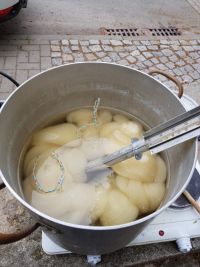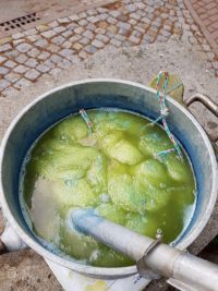 Darum hatten wir schon einige Zeit zuvor Waidpulver erstanden, das nun zum Einsatz kam. Ein Tipp aus den Tiefen des Internet brachte uns darauf, als Chemie zum Auflösen des Indigo im Wasser Entfärber zu nutzen. Wir waren zuerst gespannt und dann erstaunt, weil das wunderbar funktionierte. Die Rohwolle war zu einem Zopf geflochten worden, damit die Wolle sich nicht verheddern konnte. Wir wollten mit ihr ja noch arbeiten.