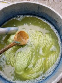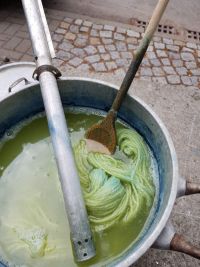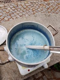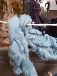 Das Ergebnis zeigte ein schönes Hellblau, die Wolle wirkte jedoch etwas verfilzt. Sie lies sich aber, wie sich später herausstellte, noch verspinnen. Da die Küpe einmal angesetzt war, wurde auch noch bereits versponnene (versponnen gekaufte) Wolle gefärbt.