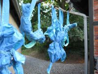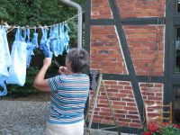 Während vor dem Bürgerhaus kräftig im Färbetopf gerührt wurde, war man hinten im Hof auch nicht untätig. Hier galt es die Ausschmückung der Zelte voran zu bringen. Hauptsächlich sollten zunächst die Elektrokabel für die Beleuchtung und die Beleuchtung, also unsere Kronleuchter und Lichtschläuche, selbst installiert werden. Im Anschluss begann die Arbeit der Dekoration. Dazu wurden die Kartons mit dem eingelagerten Organzastreifen geöffnet und diese dann sortiert.Die Beutel an der Leine waren indesssen von ihren Verknotungen befreit und ausgewaschen worden. Wir waren von den Musterungen begeistert und wollten am nächsten Tag noch eine Galerie Stoffbeutel färben.