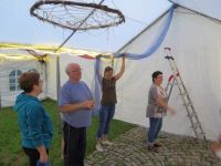 Das 15. Waidfest rückte näher. Es sollte am 7. September "über die Bühne" gehen und wir wollten uns bis dahin genug Zeit für den Aufbau geben. Zumal einige Tage zuvor noch das Sommertheater im Waidfstzelt stattfinden sollte. Die Theke hatten wir bereits aufgestellt. Jetzt ging es um die Zelte und deren Ausschmückung. Der erste Termin für den Aufbau hatten wir auf den 30. August gelegt. Der Tag war ziemlich heiß und wir trafen uns in den Nachmittagsstunden. Unterstützung war zum Termin erschienen, denn der neugegründete Kirmesverein wollte uns beim Zeltaufbau unter die Arme greifen.