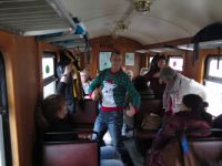 Gleich nebenan öffnete sich ein Lok-Schuppen, aus dem dampfend und schmauchend eine Dampflok heraus fuhr. Mit einem Tannenbaum vorne geschmückt, sah sie recht weihnachtlich aus. Anscheinend handelte es sich um die Lok, die unsere Hänger ziehen würde. Wir sahen uns eine Weile im Schalterraum um, wo man neben den Fahrkarten auch allerlei Souvenirs erwerben konnte und stiegen dann in unsere reservierten Waggons ein. (der Dritte und Vierte von hinten)