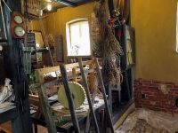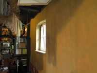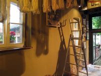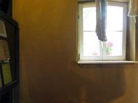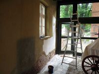 Inzwischen war der Putz von der Wand geklopft worden und wir konnten am 10 Juni 2020 mit den Renovierungsarbeiten beginnen. Wie schon im hinteren Teil des Museums sollte die Wandfarbe so aussehen, als befände man sich in einem mit Lehm verputzen Haus. Die freigelegten Ziegelsteine wurden mit Tiefengrund behandelt (besonders die Fugen) und die Wand erhielt ihren lehmigen Anstrich.