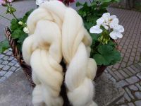 Diesmal sollte Rohwolle gefärbt werden, die zu einem lockeren Zopf gebunden war, damit sie sich nicht verhedderte.