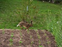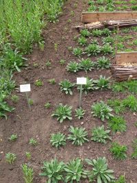 Auch im Festungsgraben, der bunt bepflanzt war, gab es Waid zu sehen. Dort war eine ganze Ecke für Färberpflanzen reserviert und der BUGA-Hase sauste am Waidbeet vorbei. Links im Bild sind junge Waidpflanzen im ersten Wachstumsjahr zu sehen und rechts stehen Pflanzen kurz vor der Blüte im zweiten Jahr.